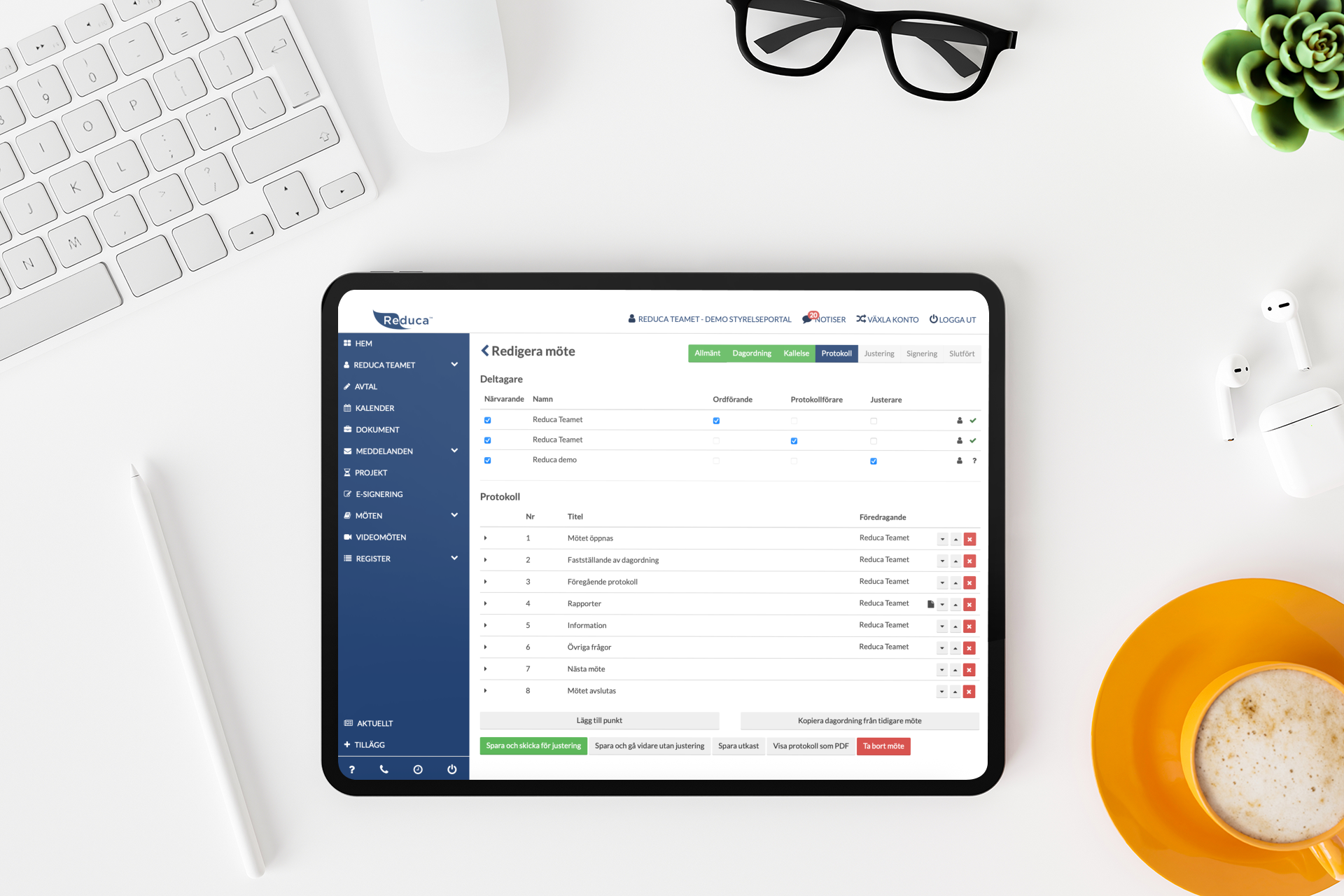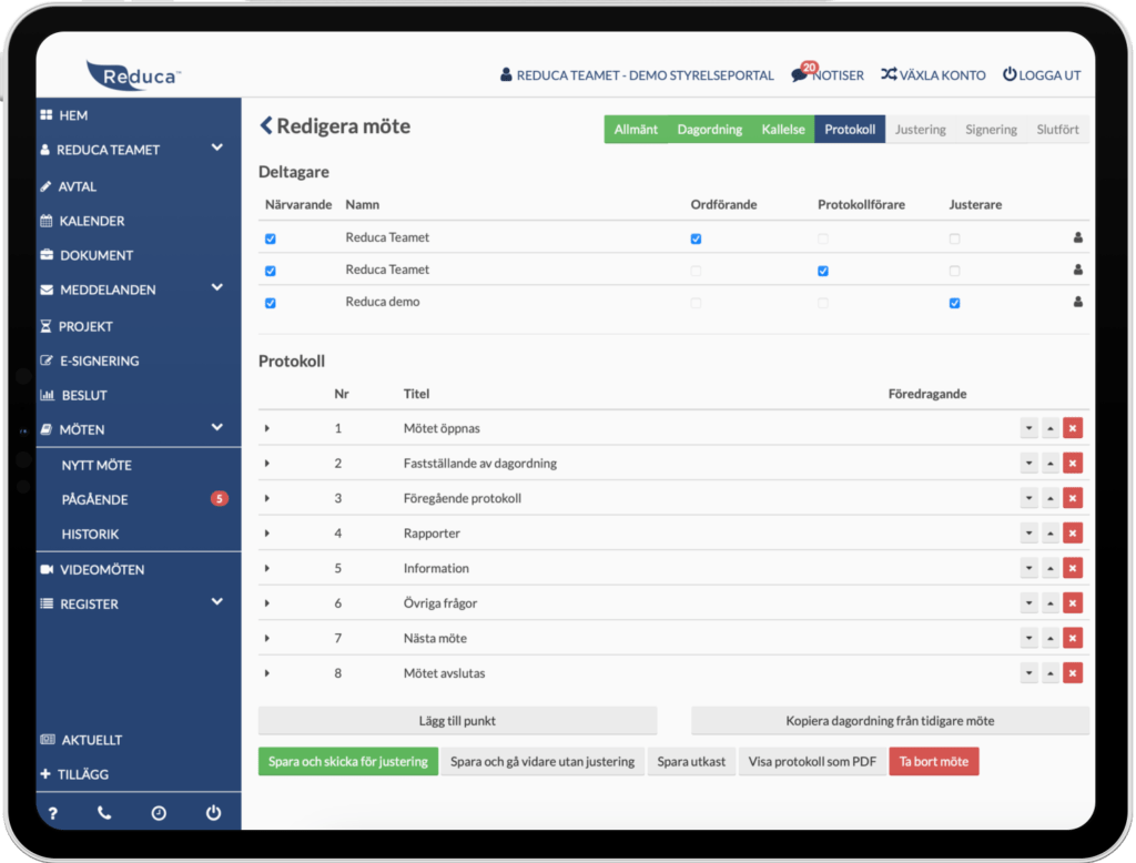 I mötesmallen kan ni skapa en detaljerad dagordning med bifogade bilagor, skicka ut möteskallelser, skriva och justera protokoll samt genomföra signering – allt direkt i styrelseportalen. Funktionen är utformad för att göra mötesprocessen så smidig och effektiv som möjligt, vilket sparar tid och ger bättre struktur åt era styrelsemöten.